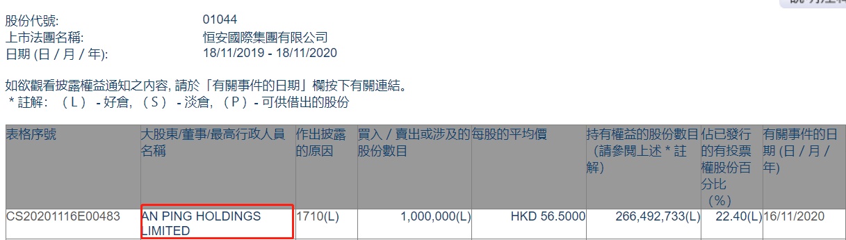 智通财经APP获悉,香港联交所最新资料显示,11月16日,AN PING HOLDINGS LIMITED增持恒安国际(01044)100万股,每股作价56.5港元。总金额为5650万港元,增持后最新持股数目约为2.66亿股,最新持股比例为22.4%。