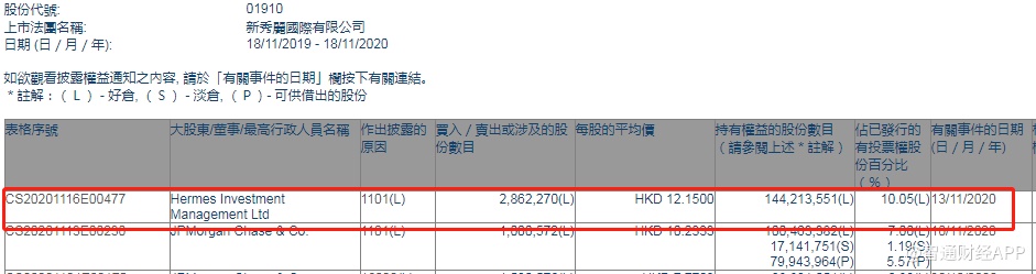 智通财经APP获悉,香港联交所最新资料显示,11月13日,Hermes Investment Management Ltd增持新秀丽(01910)约286.23万股,每股作价12.15港元,总金额约为3477.69万港元。增持后最新持股数目约为1.44亿股,最新持股比例为10.05%。