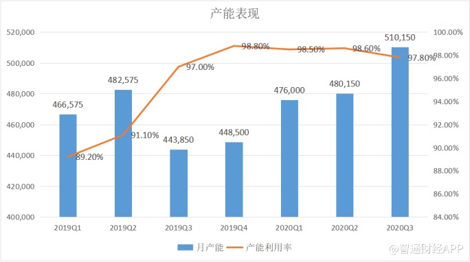 具体来看,公司三季度销售晶圆数量达到144万片,同比增长9.5%;月产能也由二季度的48万片提高至51万片,产能利用率已连续五个季度高于97%,景气度维持在高位。