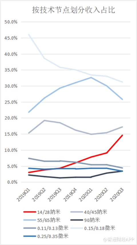 而其中,14nm/28nm先进工艺占比的快速提升,则是公司此次季报中的亮点之一。截至2020年三季度,中芯国际14nm/28nm工艺收入占比达到14.6%,同比增长了10.3个百分点。