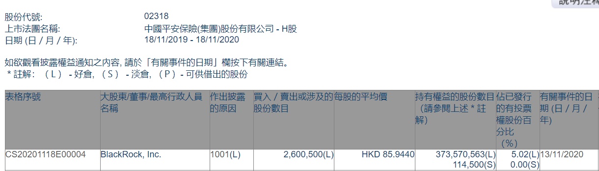 智通财经APP获悉,香港联交所最新资料显示,11月13日,贝莱德集团增持中国平安(02318)260.05万股,每股作价85.944港元。总金额约为2.23亿港元,增持后最新持股数目约为3.74亿股,最新持股比例为5.02%。