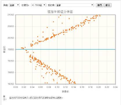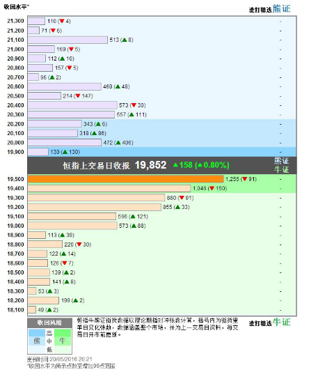 恒生指数5月经历了一系列挫折后,明显在20000点下面受到支撑,但成交量未见持续放大。衍生品牛熊证区间熊证离指数密集度开始增多(图1),说明下跌动能逐渐消失,恒生指数有企稳迹象。而恒指在19200点到20000点之间的牛证也相当密集,不排除主力在震荡中杀牛的可能性(图2)。