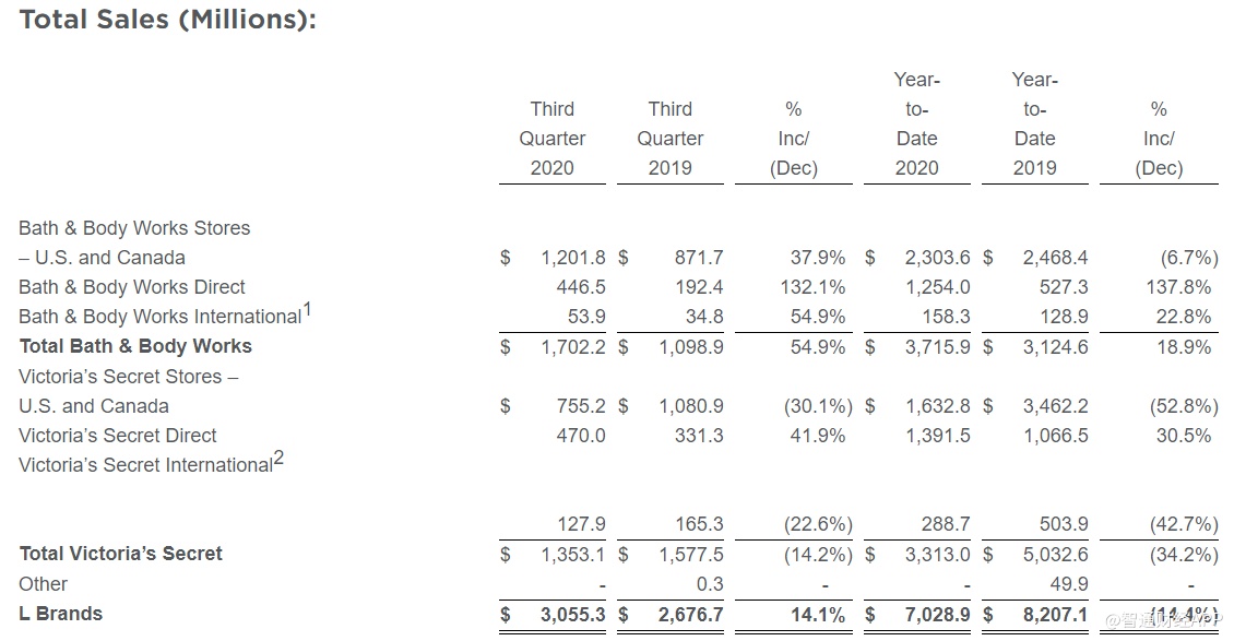 维多利亚的秘密销售额为13.53亿美元,同比下降14.2%。其中,在美国和加拿大地区的销售额为7.55亿美元,同比下降30.1%。