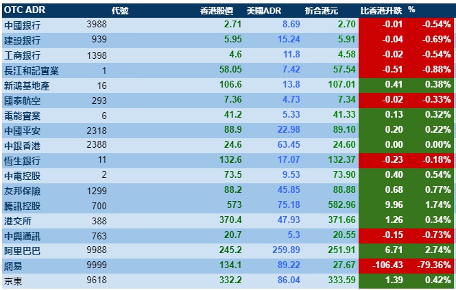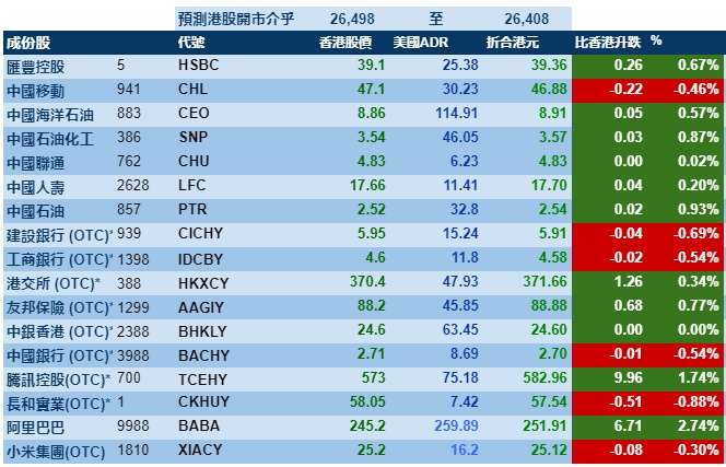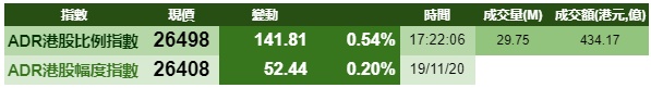 智通财经APP获悉,隔夜美股小幅上涨,港股ADR指数跟随上扬,按比例计算,收报26498点,涨141.81点或0.54%。