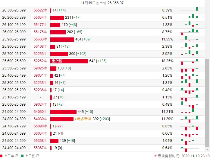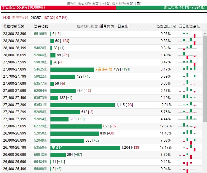 智通财经APP获悉,截至11月19日,恒指最新的牛熊街货比例56:44。法兴恒指牛熊证街货分布图中的数据显示,熊证街货重货区在26700-26799区间,该区间最新熊证数量为1204张,较上一交易日减少139张;最多新增在27800-27899区间,该区间最新熊证数量为759张,较上一交易日增加191张。牛证街货重货区在25600-25699区间,该区间最新牛证数量为642张,较上一交易日增加136张,最多新增区在24800-24899区间,该区间最新牛证数量为392张,较上一交易日增加203张。
