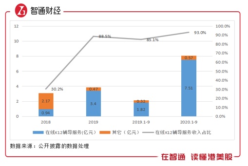 该公司业绩收入于今年大幅度加速,2019年及2020年首入九个月,收入分别为4.06亿元和8.08亿元,同比分别增长30.97%和277.6%,核心业务为K12在线服务服务,2020年首九个月收入贡献93%。
