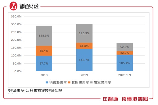该公司各项费用率都非常高,2020年首九个月,销售费用率、管理费用率以及研发费用率分别为105.4%、22.7%以及52.3%,今年这三项费用率同比下降幅度均较大,但从往年看,这三项费用率合计均超过150%。
