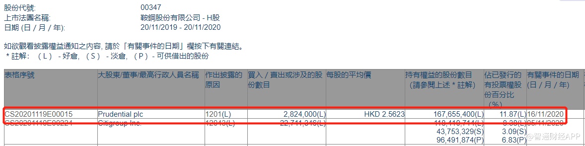 智通财经APP获悉,香港联交所最新资料显示,11月16日,Prudential plc减持鞍钢股份(00347)282.4万股,每股作价为2.5623港元,总金额约为723.59万港元。减持后最新持股数目约为1.68亿股,最新持股比例为11.87%。