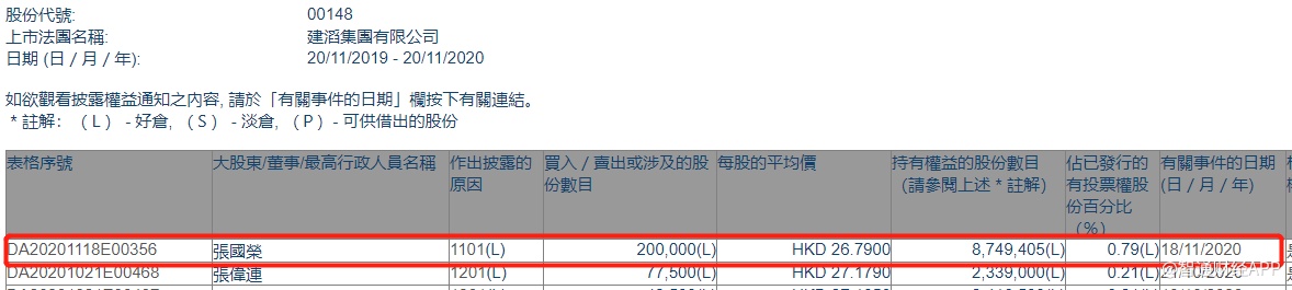 智通财经APP获悉,香港联交所最新资料显示,11月18日,主席兼执董张国荣增持建滔集团(00148)20万股,每股作价为26.79港元,总金额为535.8万港元。增持后最新持股数目约为874.94万股,最新持股比例为0.79%。