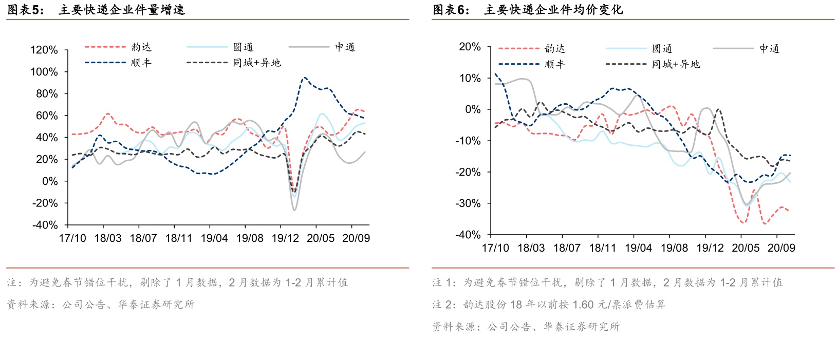 10月,分业务看,同城件量同比增长3.4%(9月:20.8%),异地件同比增长51.3%(9月:49.8%);国内(同城+异地)件均价同比下降16.4%至6.01元(9月:同比下降16.1%至6.37元)。10月,分企业看,韵达/圆通/申通/顺丰件量同比分别增长63.8%/53.1%/26.6%/57.3%,件量整体高速增长;件均价同比分别下降32.7%/23.2%/20.3%/14.7%,环比分别+1.5%/-1.6%/+3.4%/-5.2%,市场竞争激烈(数据来源:邮政局/公司公告)。