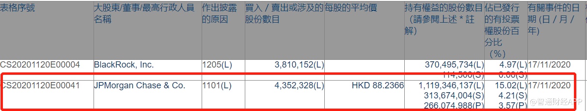 智通财经APP获悉,香港联交所最新资料显示,11月17日,摩根大通增持中国平安(02318)435.2328万股,每股作价88.2366港元,总金额约为3.84亿港元。增持后最新持股数目约为11.19亿股,最新持股比例为15.02%。