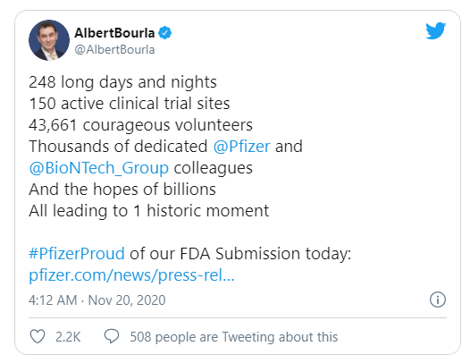 95%有效 本周早些时候,辉瑞和BioNTech公布了这款疫苗在3期临床试验中的最新结果。新闻稿指出,在这项有数万人参加的临床试验中,迄今共分析了170名新冠确诊病例。分析指出其中162人来自安慰剂对照组,占绝大部分。而接受了疫苗,最终又感染新冠病毒的仅为8人。基于这些结果,两家公司宣布该疫苗达到主要疗效终点,疫苗有效率为95%(p<0.0001)。数据监督委员会也没有指出任何与疫苗相关的严重安全问题。 顾问委员会讨论些什么? 目前关于这款疫苗的公开数据较为有限,且均来自辉瑞和BioNTech的新闻稿。将于12月初举办的疫苗顾问委员会会议上,我们有望获得关于疫苗的更多数据。根据美联社报道,在会议召开前,FDA会先在内部公布分析结果,作为当天讨论的基础。议题有可能关于新型mRNA疫苗技术的表现,以及任何安全性隐患。 除了是否应该批准该疫苗,专家们也会讨论涉及实际应用的问题,譬如哪些群体适合接受这些疫苗。年长群体,患有其他疾病的成年人,较年轻的健康群体,12岁以下的儿童,或是孕妇,需要考虑的问题各有不同。 不等于正式批准 FDA疫苗办公室负责人Marion Gruber博士指出,即便获得紧急使用授权,也不代表它获得了正式批准。相反,FDA依旧将其视作一款“在研”疫苗。这也意味着每一名接种疫苗的个体,都会在接种前获得一张清单,上头列举了潜在的益处和风险。 这是因为我们目前还没有看到这款疫苗的全貌。我们知道它有95%的有效率,但这一数据基于出现症状,且接受检测的志愿者。疫苗会减少无症状感染者的数量吗?疫苗的保护效果又能持续多久?这些都是悬而未决的问题,也是为何我们需要继续进行临床研究。而基于伦理考量,接受安慰剂注射的志愿者,在将来的某一时刻会需要接受真的疫苗,这又会增加临床数据分析的复杂度。 实际生产 和常规的小分子药物相比,疫苗的生产更为复杂。考虑到巨大的需求,疫苗生产商需要确保数千万,乃至数十亿剂疫苗的质量保持一致。这也表明FDA在审评这款疫苗时,不仅会考虑疫苗本身的安全性和疗效数据,还会考虑疫苗的生产方式是否正确。无论是辉瑞/BioNTech的疫苗,还是Moderna的疫苗,都属于全新的mRNA疫苗类型,迄今尚未有同类产品获FDA批准。因此在生产方式的评估方面,并没有太多的现有经验可以借鉴。 谁能先使用上疫苗? 辉瑞和BioNTech的生产能力可以在今年年底制造最多5000万剂疫苗。到明年年底,可生产至多13亿剂疫苗。与此同时,全球人口已经超过了78亿。尽管EndPoints的报道指出辉瑞可以在EUA申请获批(如果获批的话)的数小时后开始疫苗的配送,但显然,并非所有人都能在第一时间接种上疫苗。 在美国,疾病控制和预防中心的顾问会给出建议,决定哪些人群会优先得到疫苗。通常来讲,全球的共识是让医务人员率先接种,保护这些奋战在抗疫第一线的健康卫士。但之后呢?不同国家,不同地区需要考虑的因素各有不同,让情况变得更为复杂。 譬如在美国,年轻的成年人是病毒感染和传播的主要群体,为此有些专家认为年幼儿童接种的优先级不高(较少接触这些年轻成年人)。但在印度,多代人往往居住在同一屋檐下,因此无论是年轻成年人,还是年幼儿童,都需要疫苗的保护。又譬如在纽约,模型估计已有20%的人口曾感染病毒,当下的传播率又非常低,因此只需要额外接种40%的人口,就能起到很好的人群防护效果。但在其他地区,这个数字肯定又会不一样。 面对这些复杂的问题,美国卫生与公众服务部部长Alex Azar医生期望在FDA做出决定时,我们能有一个具体的决策方案。 荣耀属于所有人 248个漫长的日夜 150个活跃的临床试验中心 43661名勇敢的志愿者 数千名尽心尽力的辉瑞和BioNTech员工 以及数十亿人的期望 通向了这个历史性的时刻 这是辉瑞董事长兼首席执行官Albert Bourla博士今日在社交媒体上的一条动态。是的,今年年初,新冠病毒还是一种充满太多未知的陌生病毒。但还没到12月,全球已有多款疫苗取得了优异的成果,更多疫苗正在研发之中。相比传统上动辄需要数年的疫苗开发,全球医药人用创纪录的速度,在今年交出了一份了不起的答卷。在此,我们也向所有参与疫苗研发的科学家和志愿者致以崇高敬意。