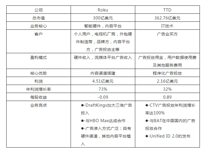 类似的地方在于,两者目前的体量,主营业务收入变化及广告投放方式。体量方面,TTD目前总市值高达362.76亿美元,与Roku近300亿美元体量相当。在主营业务收入变化方面,TTD从原来的插片广告逐渐转为精准度更高的MSA模式,而Roku也将主营业务收入由硬件销售转换为平台收入;广告投放方式方面,两者均采用程序化方式协助广告买方管理数字广告活动。