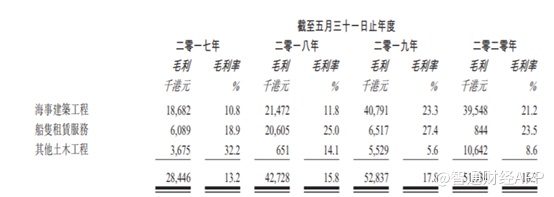从收入结构可以看到,之前公司以海事建筑工程和船只租赁为主,不过2019财年之后,其他土木工程的收入占比迅速增大,据了解是因为公司准备集中精力于获取其他土木工程项目,因此投标项目向其他土木工程项目倾斜。