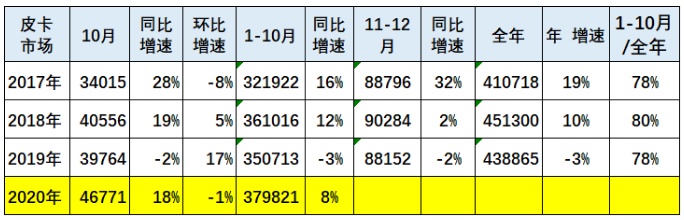 2020年10月份皮卡市场销售4.7万辆,同比增长18%,环比下降1%。从同比增速对比看,相对于2019年的10月同比18年下滑2%,由于卫生事件后回暖因素导致今年10月表现较强。