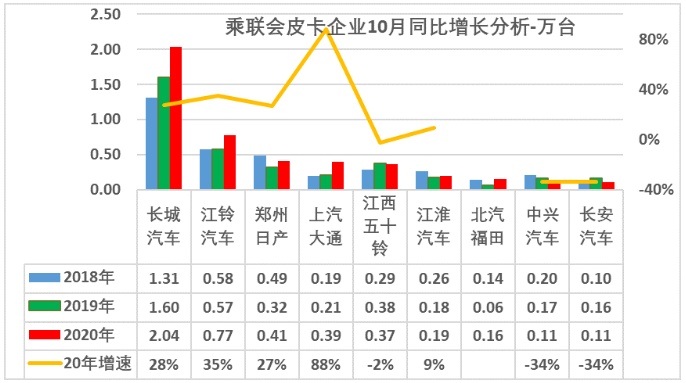 根据乘联会数据,2020年10月份皮卡市场销售4.7万辆,同比增长18%,月度继续保持超强走势。今年1-10月皮卡总量增长8%,这也是相对于2019年的1-10月皮卡市场强势增长,今年由于卫生事件因素和北京需求波动导致同比下滑较大。近几年皮卡成为乘商结合的消费新热点,持续表现较强,但近期皮卡车企分化,主力车企强势提升,部分传统皮卡企业面临巨大的增长压力。