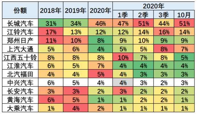 2020年皮卡市场主力厂商表现较好,长城汽车(02333)皮卡保持平稳的绝对优势地位,江西五十铃近期走强,上汽大通、长安汽车、北汽福田等快速崛起。10月的江淮汽车、中兴汽车等表现相对较稳,上汽大通、北汽福田等出现较大增长。