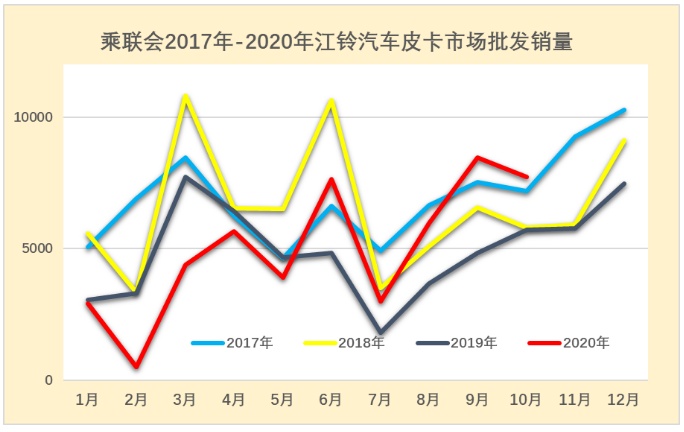 2020年江铃皮卡随着车市的动荡而销量调整较大。前期江铃皮卡也是处于国六调整过程中,19年前期销量主动调整,后期开始逐步恢复。
