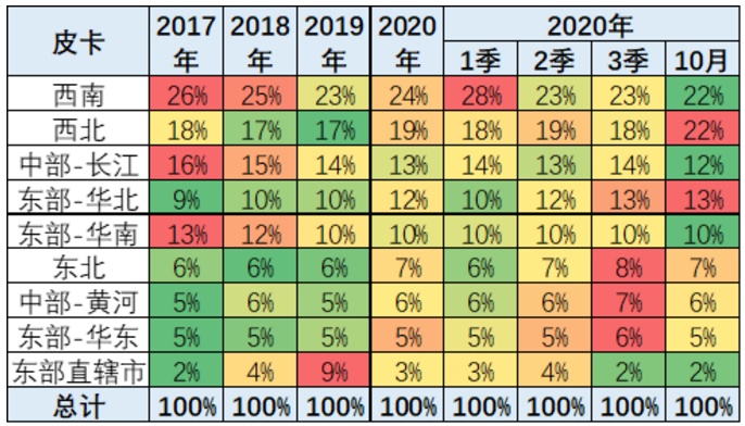 受到卫生事件影响,近期的皮卡销量与前期结构发生剧烈变化,西南地区表现特别突出,同比份额大幅增长。东部长江地区份额也大幅提升。