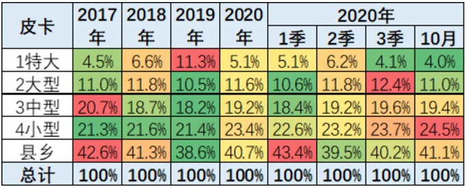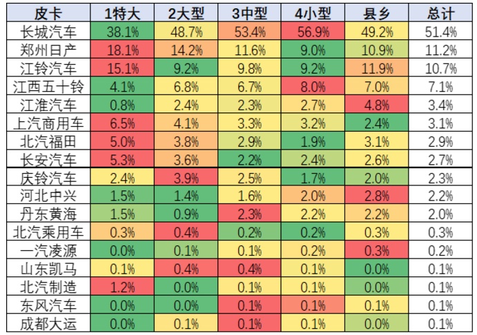 上图是皮卡城市份额分布。卫生事件下皮卡市场的区域发生重大变化,县乡市场份额上升明显。大城市市场暂时萎缩。