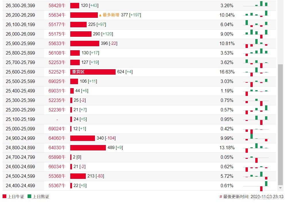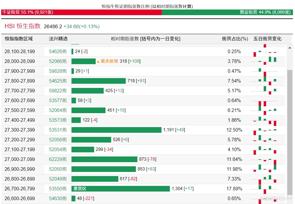 智通财经APP获悉,截至11月23日,恒指最新的牛熊街货比例55:45。法兴恒指牛熊证街货分布图中的数据显示,熊证街货重货区在26700-26799区间,该区间最新熊证数量为1304张,较上一交易日增加17张;最多新增在28000-28099区间,该区间最新熊证数量为318,较上一交易日增加109张。牛证街货重货区在25600-25699区间,该区间最新牛证数量为624张,较上一交易日增加4张,最多新增区在26200-26299区间,该区间最新牛证数量为377张,较上一交易日增加197张。