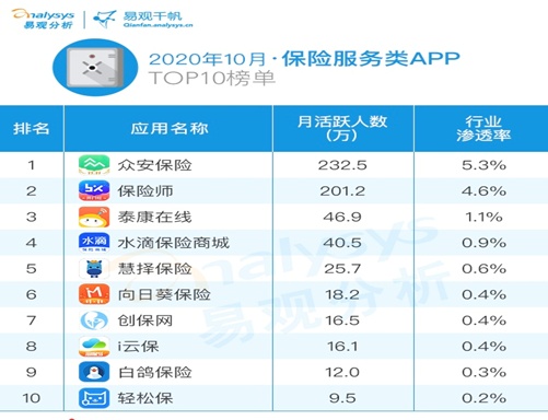 11月24日,易观发布《2020年10月新兴互联网保险服务类APP用户洞察榜单》(以下简称“榜单”),对2020年10月整个保险服务领域APP活跃用户及行业渗透进行了总结分析。数据显示,从保险服务领域APP的用户活跃度、 行业渗透率来看,新兴互联网保险领域具有较大的发展潜力,其中众安保险(06060)等头部的互联网保险公司的优势也更加凸显。10月,众安保险以232.5万活跃用户规模居首,同时在保险服务行业渗透率最高,达到5.3%。而刚刚过去的“双11”,各保险公司也将APP作为营销服务的主战场,而众安保险在活动期间日活用户高峰时达到82.7万人,投保用户数同比增长247%。