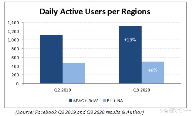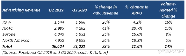 可以看到,Facebook所有地区的业绩都受益于较高的ARPU。尽管亚太地区的ARPU增长最快,但北美和欧洲的ARPU增长也很强劲。由于许多公司(尤其是中小企业)正在将业务转移到网上,亚太地区的业务量增长要强劲得多,而欧洲和北美的业务量增长率仍为正数。