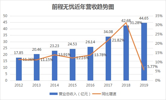 通过回溯前程无忧过往业绩可以发现,近十年以来,公司一直基本维持着双位数的高增长,随之而来的是美股市值的不断走高。然而从2018年开始,公司营收增长趋势开始有较为显著的放缓。公司2018年营收为37.82亿元,同比增长31.3%;2019年营收为40亿元,同比增长5.77%,从31.3%到5.77%,可以很清楚的看到其营收增速呈断崖式下跌。