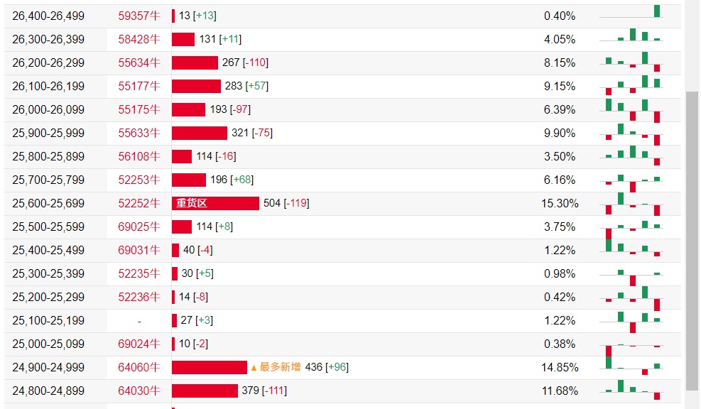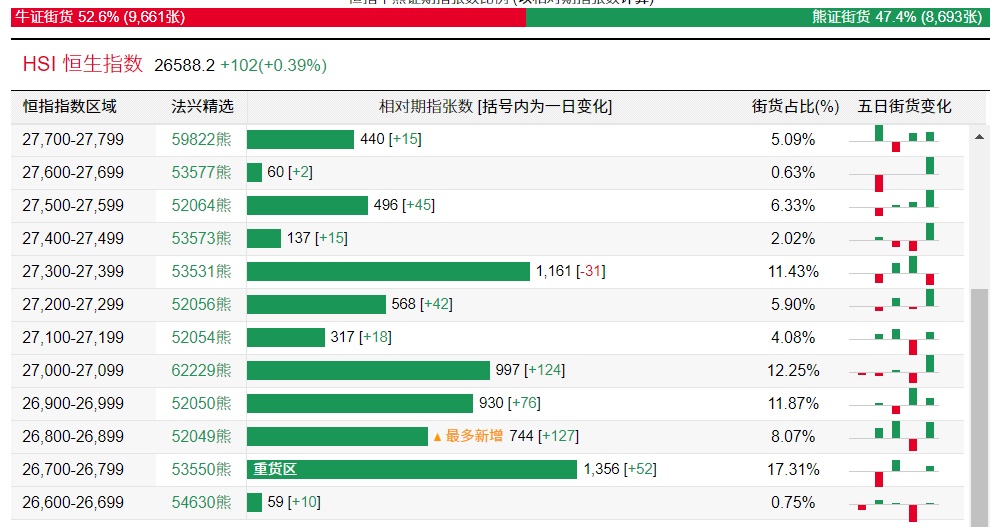 智通财经APP获悉,截至11月24日,恒指最新的牛熊街货比例53:47。法兴恒指牛熊证街货分布图中的数据显示,熊证街货重货区在26700-26799区间,该区间最新熊证数量为1356张,较上一交易日增加52张;最多新增在26800-26899区间,该区间最新熊证数量为744张,较上一交易日增加127张。牛证街货重货区在25600-25699区间,该区间最新牛证数量为504张,较上一交易日减少119张,最多新增区在24900-24999区间,该区间最新牛证数量为436张,较上一交易日增加96张。
