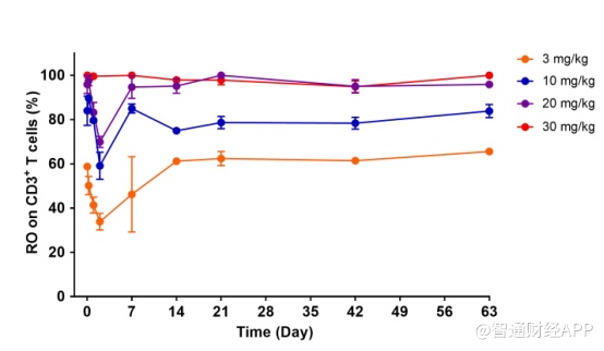 另外,本次临床研究中发现,lemzoparlimab在外周血CD3 + T细胞CD47受体上的占有率(RO)呈剂量依赖性增加。每周使用lemzoparlimab 20~30 mg/kg后,外周T细胞上CD47受体的占有率达到最大饱和度。而此次公布的数据表明,lemzoparlimab在给药剂量抵达30mg/kg时并未出现剂量限制毒性,因此其疗效不会受到毒性限制。