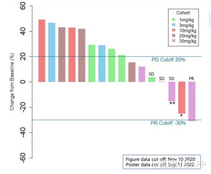 此外,研究还展现出lemzoparlimab单药治疗实体瘤的初步疗效信号。截止到2020年11月10日,入组患者中观察到1例部分缓解(PR)、3例病情稳定(SD)。