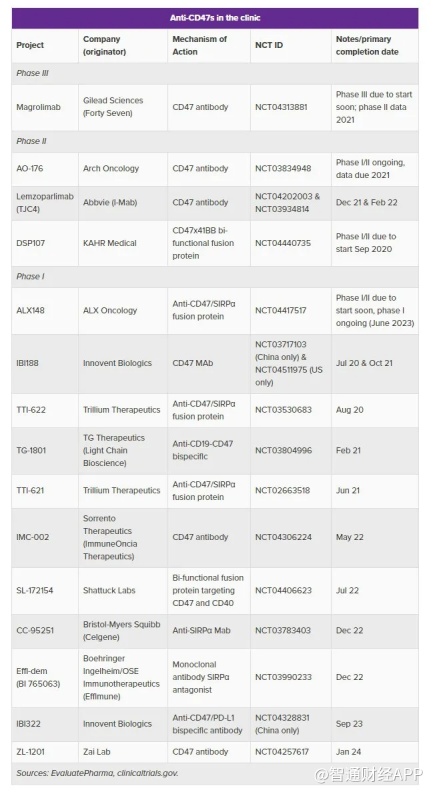 在海外,目前走在最前列的正是吉利德从Forty Seven收购而来的Magrolimab,此外Trillium、Arch Oncology和ALX Oncology等公司的CD47相关项目也在陆续推进中;而在中国,目前国内申报临床的CD47药物也已多达10款。