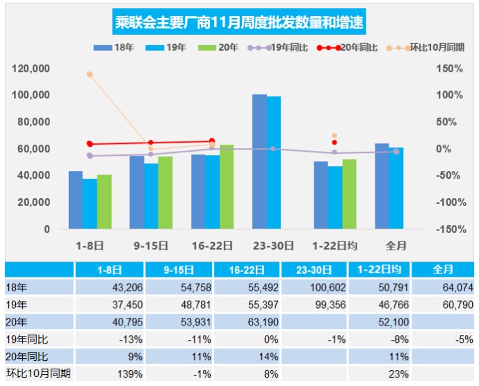 总体看,11月前三周的销量同比增长11%,较18年同期增3%,相对较平稳。11月前三周厂商批发环比10月同期增长23%,工作日长的优势较明显。