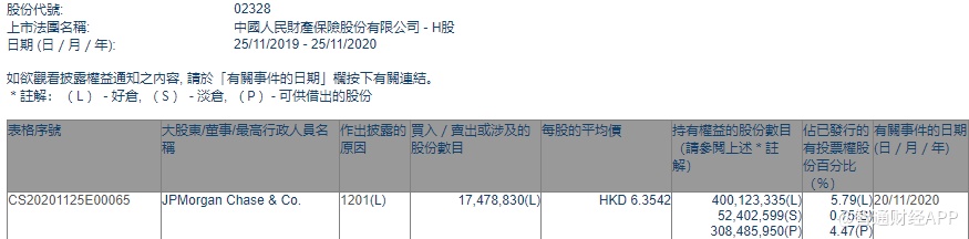 智通财经APP获悉,香港联交所最新资料显示,11月20日,摩根大通减持中国财险(02328)1747.883万股,每股作价 6.3542港元,总金额约为1.11亿港元,减持后最新持股数目约为4.00亿股,最新持股比例为5.79%。