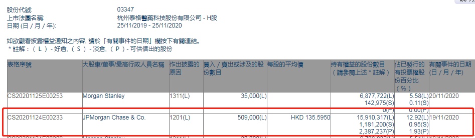 智通财经APP获悉,香港联交所最新资料显示,11月19日,摩根大通减持泰格医药(03347)50.9万股,每股作价135.595港元,总金额约为6900万港元。减持后最新持股数目约为1591万股,最新持股比列为12.92%。