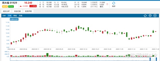 除此之外,周大福管理层预期10-12月的同店销售可以维持在低双位数,并于明年1月-3月上升70%-80%,可见在疫情后时代,周大福业绩增长强劲,值得投资者重点关注。