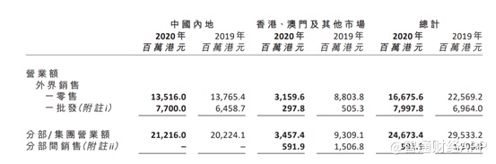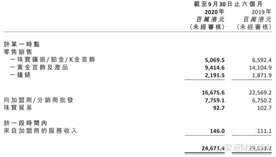按销售产品分类,珠宝/铂金/K金类产品销售额为50.70亿港元,同比下降14.0%;黄金首饰类产品销售额为94.15亿港元,同比下降21.2%;钟表类产品销售额为21.92亿港元,同比增长17.0%。