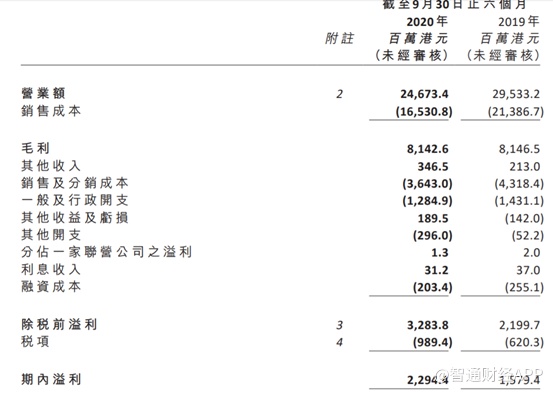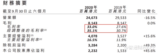 不过,受益于国际金价上涨,公司毛利率大幅提升,毛利率从27.6%提升至33.0%,提升5.4个百分点。因此,在营业额下降的条件下,毛利仅下滑0.04亿港元至81.43亿港元,与去年基本持平。