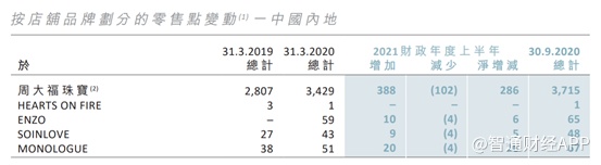 再看门店数量,截至2020年9月30日,公司销售门店达到4153家,2021上半财年共增加303家门店。其中,中国内地周大福品牌直营门店减少45家,加盟门店增长331家,合计净增长286家门店,外加其他品牌合计净增长313家。