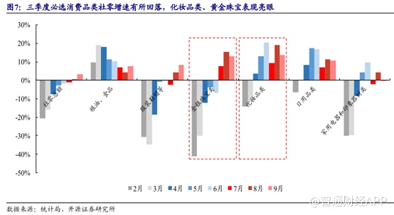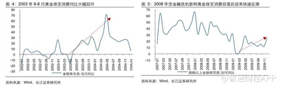例如:在非典以及2008年金融危机期间,黄金珠宝消费反弹都比较迅速。2003年非典疫情期间,影响较为严重的5月,限额以上黄金珠宝消费同比大幅下降15.8%,增速环比大幅回落14.9个百分点,但随着非典发展得到有效控制后,黄金珠宝消费快速反弹,2003年6月-8月限额以上黄金珠宝消费同比增速分别为4.3%、11.1%和18.3%。