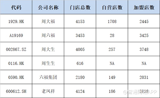 在行业复苏时,龙头企业无疑是最大的受益者。就部分上市珠宝商企业的开店数量来看,截至9月30日止,在可比珠宝商企业中,周大福的门店总数以及自营门店数量最多,总店数合计4153,其中自营门店约1708家,老凤祥(600612.SH) 排名第二,总店数4124家,但自营仅仅186家,其余均为加盟店及经销网点。