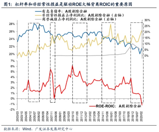 (2)03年以来的经验数据显示:杠杆率回落+非经常性损益扩张+资产(商誉)减值损失抬升,是造成ROIC扩张但ROE回落的主要原因。