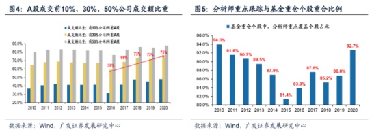分析师重点跟踪公司,多为市场一致认可的优质标的。我们在8.28《重构全动态估值:寻找性价比》中指出:随着投资者机构化以及注册制改革的推进,A股交易集中化,头部效应愈发显著。当前,前10%公司的成交额占全部A股的比重已经达到48%(一半);前30%公司的成交额占全部A股的比重已经达到75%;前50%公司的成交额占全部A股的比重已经达到88%。我们构建了基于分析师重点跟踪公司(有5家及以上机构出具盈利预期)的动态估值和盈利分析体系。同时,在基金重仓持股中,分析师重点跟踪公司的占比超过90%,受到资本市场高度认可。