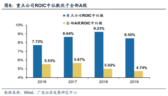 分析师重点跟踪的公司的ROIC持续高位回升。16年以来,分析师重点跟踪公司的ROIC中位数处于高位上升阶段(18年达到9.23%),而全部A股ROIC的中位数逐年回落(19年仅为4.74%)。可以看出,分析师在选择重点公司时,已经“有意无意”地将ROIC作为一个重点关注指标。