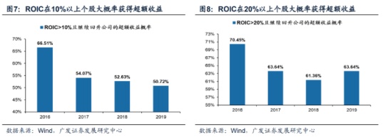 16年以来的经验数据显示:ROIC在10%以上的公司,获得超额收益的概率超过50%;更进一步,ROIC在20%以上的公司,获得超额收益的概率超过60%。