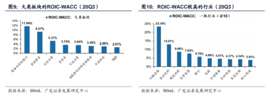 大类板块来看,20Q3金融服务和必需消费的价值创造能力相对较强,而TMT板块的价值创造能力相对较弱;细分行业来看,价值创造能力较强的行业也主要集中在金融和必需消费等领域。