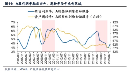 20Q3A股非金融的收入增速显著回升3.9pct,而资产增速回升幅度仅为0.1pct。资产周转率 = 收入 / 资产,四季度出口/补库将继续驱动宏观/微观景气修复斜率抬升,预计A股非金融的收入增速还将继续大幅改善(而资产增速则受“供给收缩常态化”约束),带来周转率更快“触底回升”。