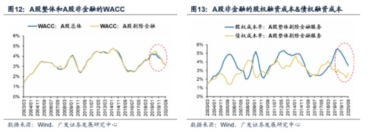 “进一步降低实体经济融资成本”仍是20年政策主线,预计A股剔除金融的WACC也将继续回落。金融供给侧改革以来,A股整体剔除金融WACC从19Q2高点的4.5%持续回落到20Q3的3.23%,其中,股权和债权融资成本都出现不同程度的下行:股权融资成本高位回落,且还有一定的下行空间——股权融资成本自5.48%降至3.59%,仍有下行的空间。债权融资成本从18Q1开始高位回落,虽然近期的部分信用违约事件进一步确认信用拐点,20Q3债权融资成本边际回升,但在“降低实体经济融资成本”主线下,企业的债权融资成本继续上行的空间比较有限。
