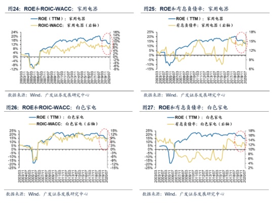 (2)家用电器(白色家电):盈利能力边际改善,关注杠杆率相对低位的白电细分领域。家电行业的有息负债率回落拖累ROE下行,但ROIC-WACC已经边际改善,随着中国地产竣工周期延续&全球/美国地产周期启动,预计家电行业的盈利能力还将继续改善,尤其建议关注杠杆率处于相对较低的白电。