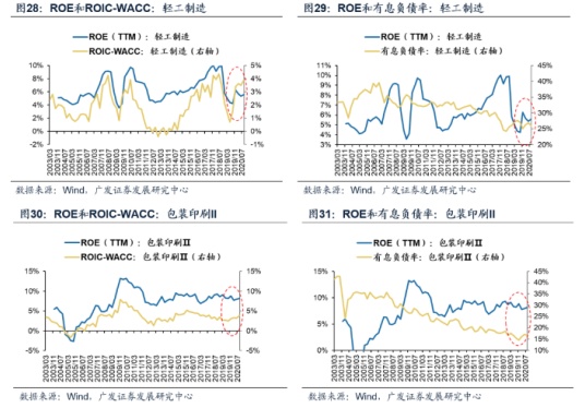 (3)轻工制造(包装印刷、家用轻工):盈利能力显著改善,杠杆率整体偏低。轻工行业的ROIC-WACC显著改善,而ROE也边际回升,行业的盈利能力正在持续优化。同时,轻工制造(包装印刷、家用轻工)整体的有息负债率均处于相对低位,具备加杠杆进一步改善盈利能力的潜能。